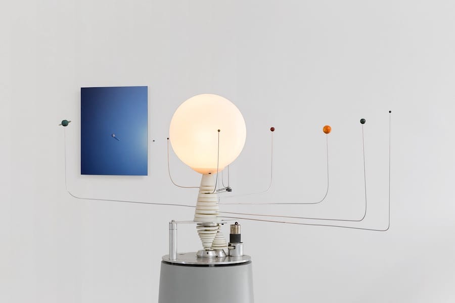 Lampada in vetro, modello planetario in legno, modello, visore in plastica e televisore, struttura in alluminio e nylon, scatola del cambio in alluminio.
