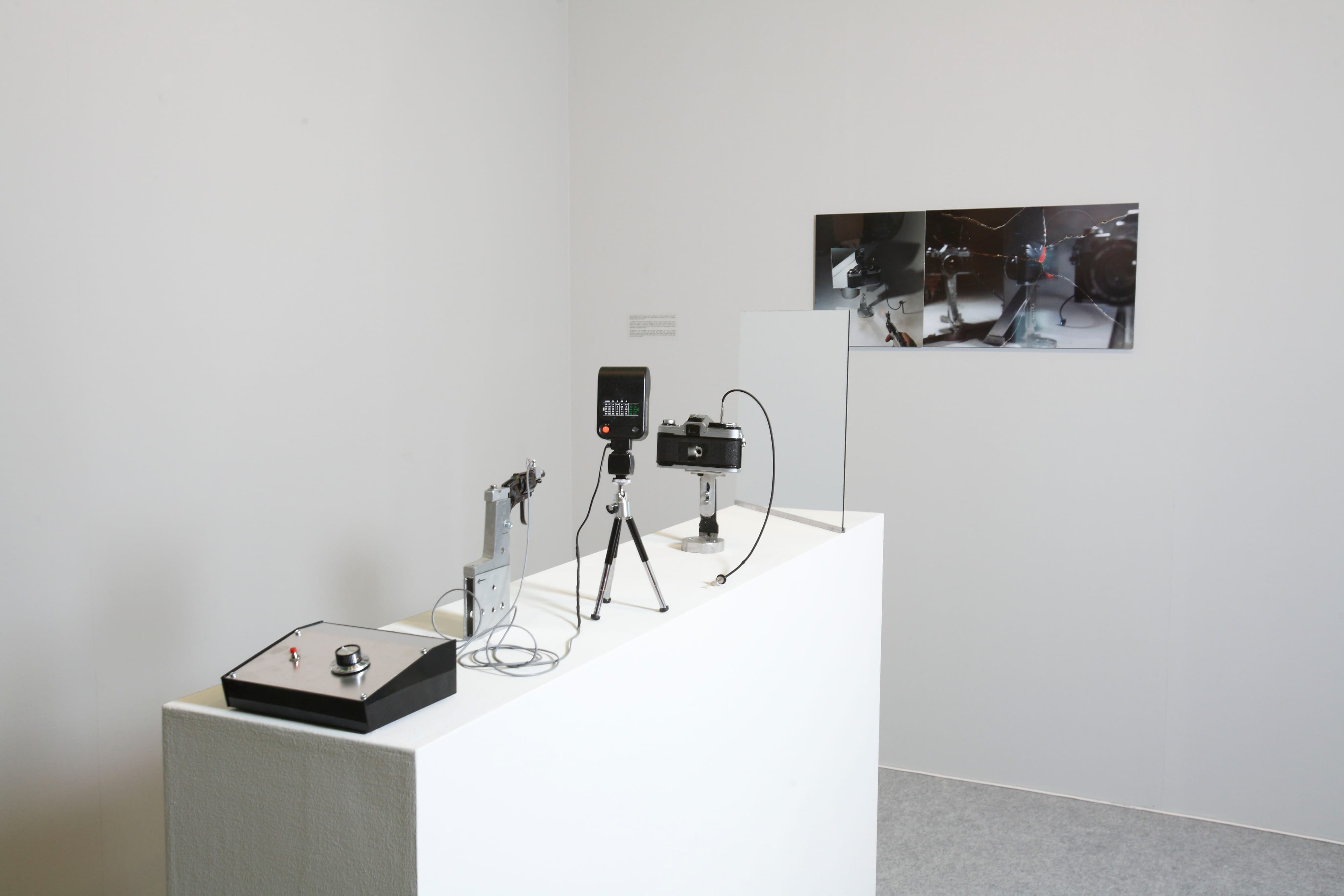 Macchina fotografica modificata, pistola, specchi, testo e materiali vari; stampa lambda on dibond