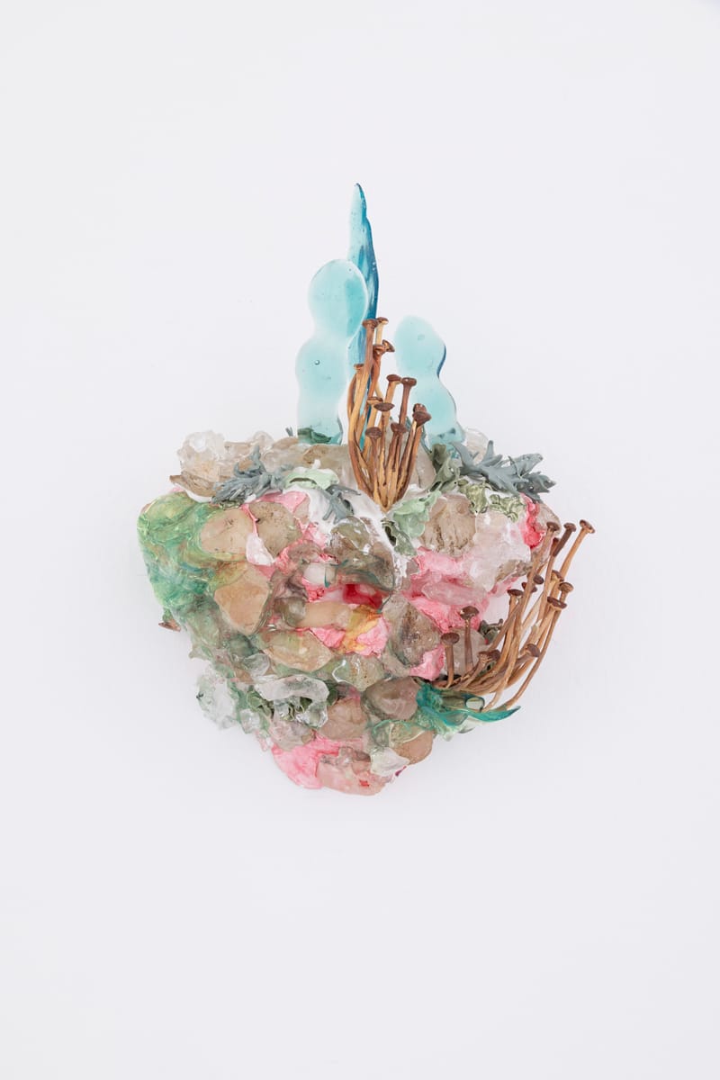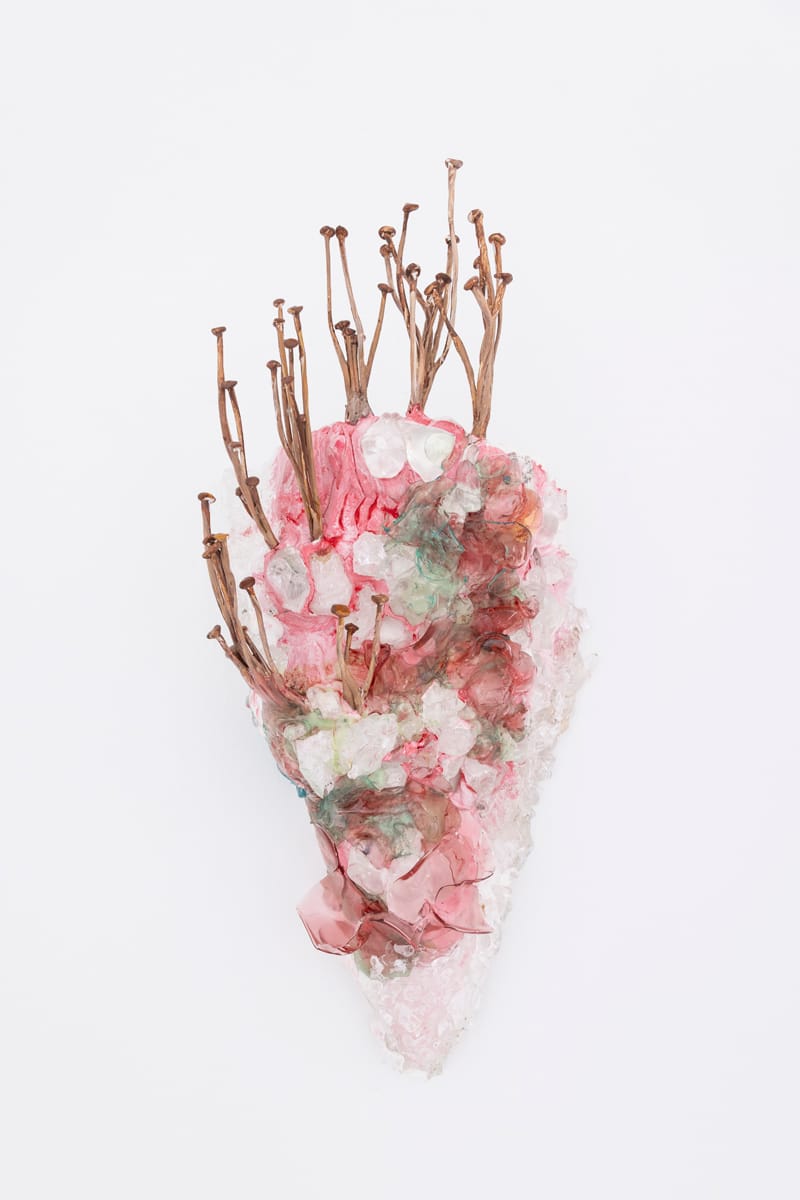 Glass, resin, metal, wood, polymer clay, acrylic paint, marble dust