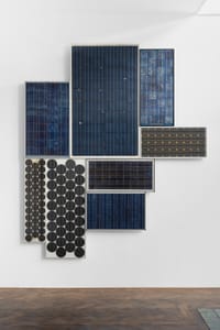 Solar panels, clearly showing signs of wear and tear from power generation, form the material basis for Judith Fegerl's large-scale wall sculpture Last Light (2021). Panels of different architecture, surfaces and different mate-rials are combined in a patch-work-like manner to form this sculpture. Torn from their technical existence, but still functional, the panels haven’t ceased to produce electricity that circulates in the photovoltaic cells as potential. On closer inspection, the materiality of the solar panels emerges: the texture of the polycrystalline silicon forms a delicate surface that changes between different shimmering shades of blue.